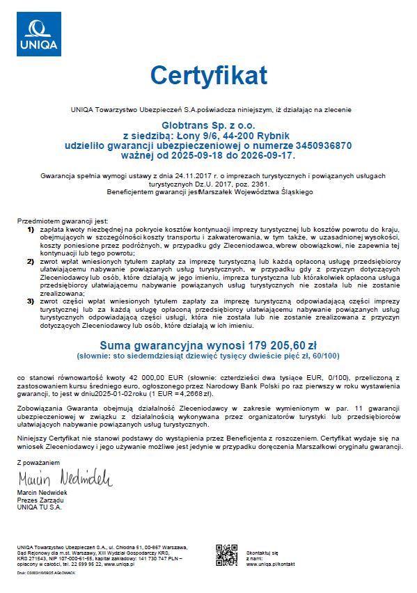 Gwarancja ubezpieczeniowa Uniqa od 18.09.2025 do 17.09.2026