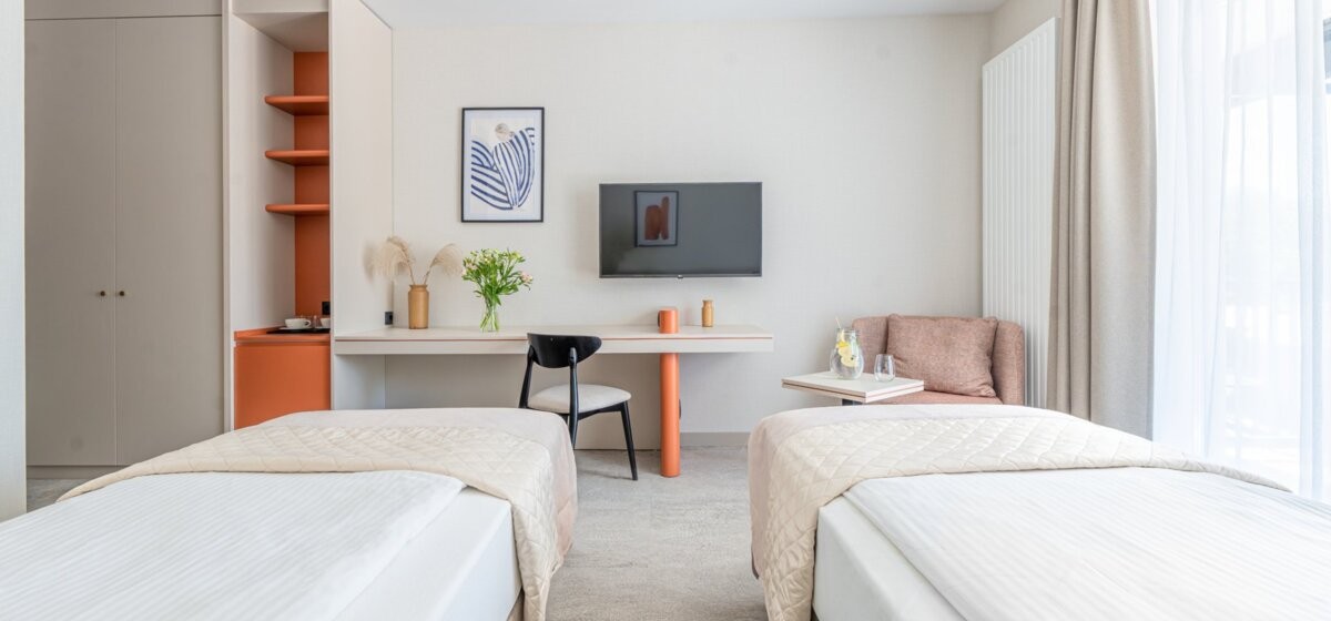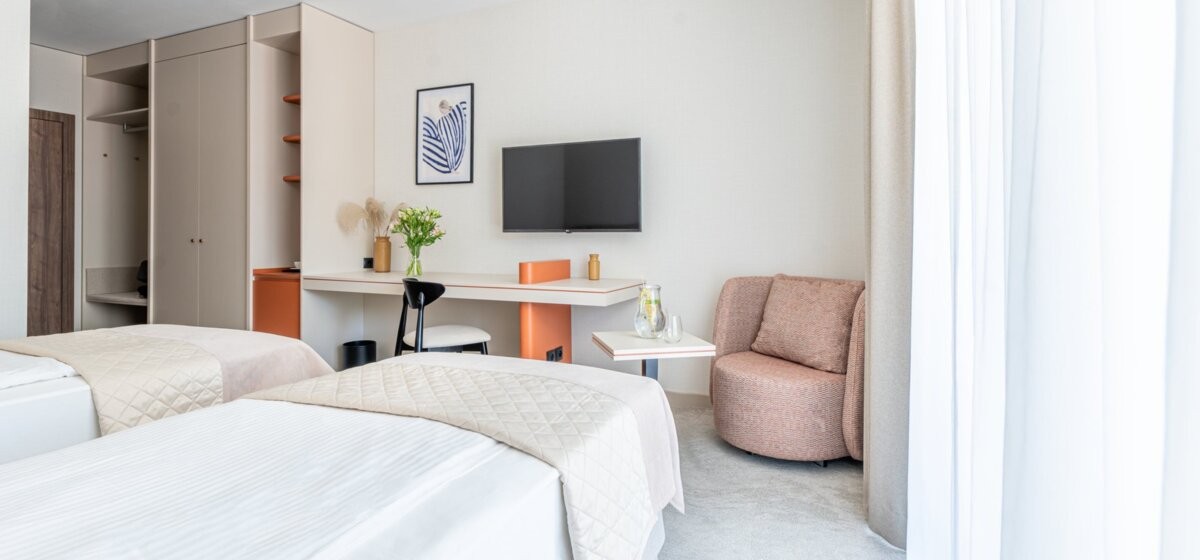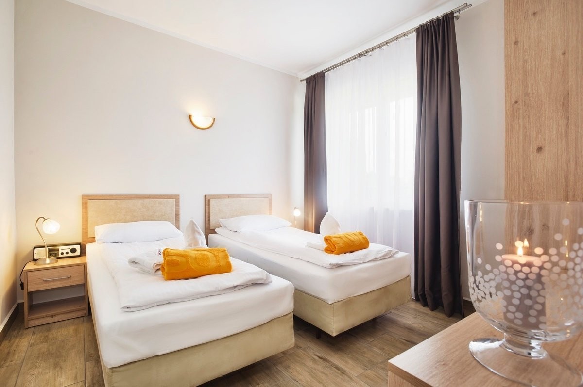 Pokój 2 osobowy Superior z balkonem - min. 24 m² sejf, balkon, czajnik, łazienka: toaleta, suszarka do włosów, prysznic, szlafrok - bezpłatnie, 2 łóżka pojedyncze, biurko, lodówka, telefon, telewizor, WIFI.