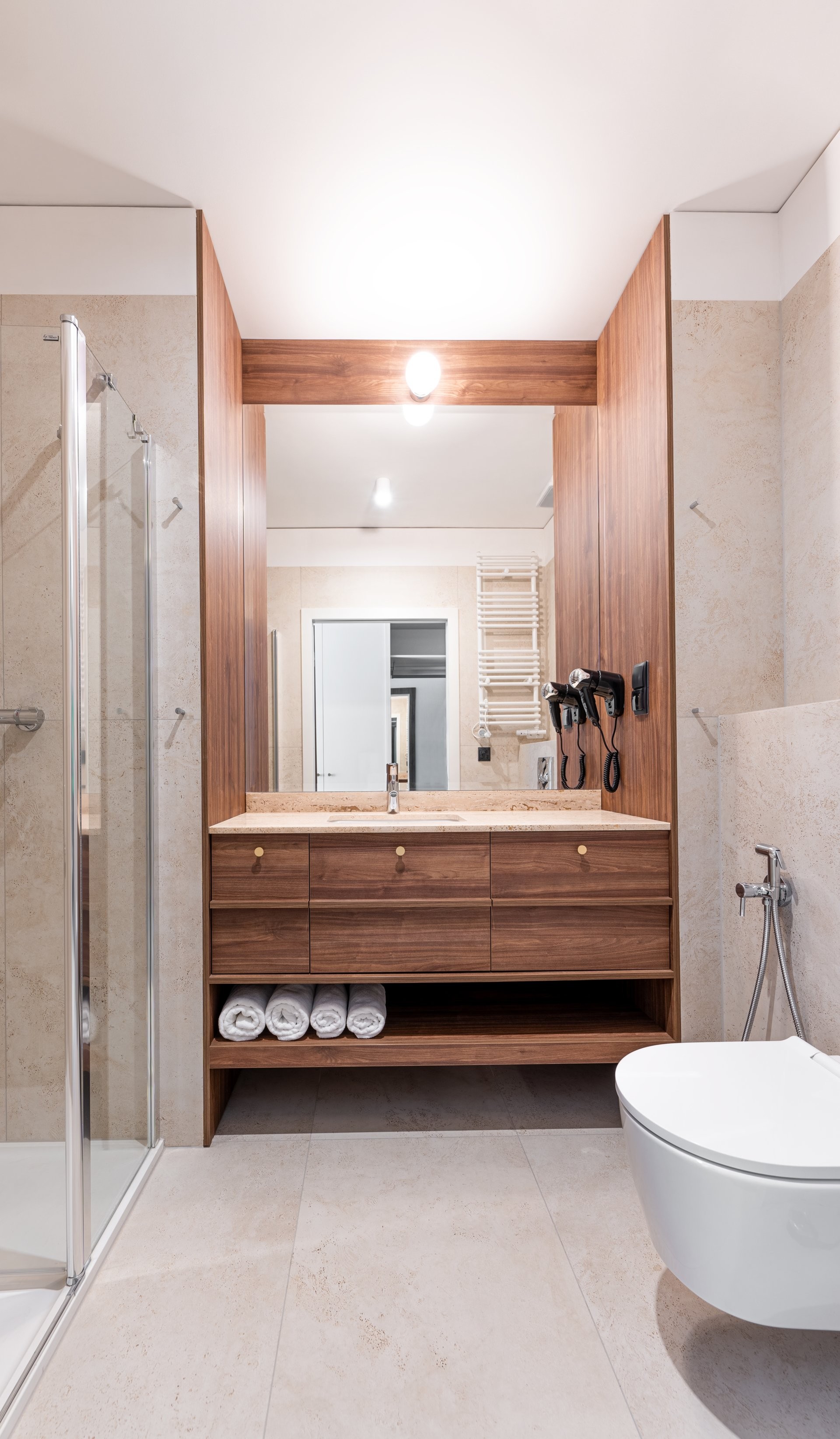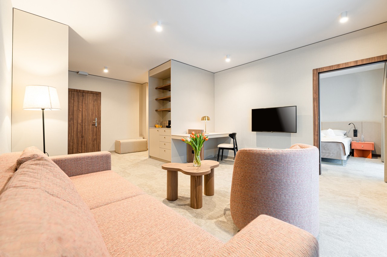 Apartament Superior z balkonem - min. 48 m², sejf, balkon, czajnik, łazienka: toaleta, suszarka do włosów, prysznic, szlafrok - bezpłatnie, sypialnia z łóżkiem dwuosobowym, pokój dzienny z sofą do spania dla 2 osób, biurko, lodówka, telefon, TV, WIFI. Ograniczony widok na morze i jezioro.