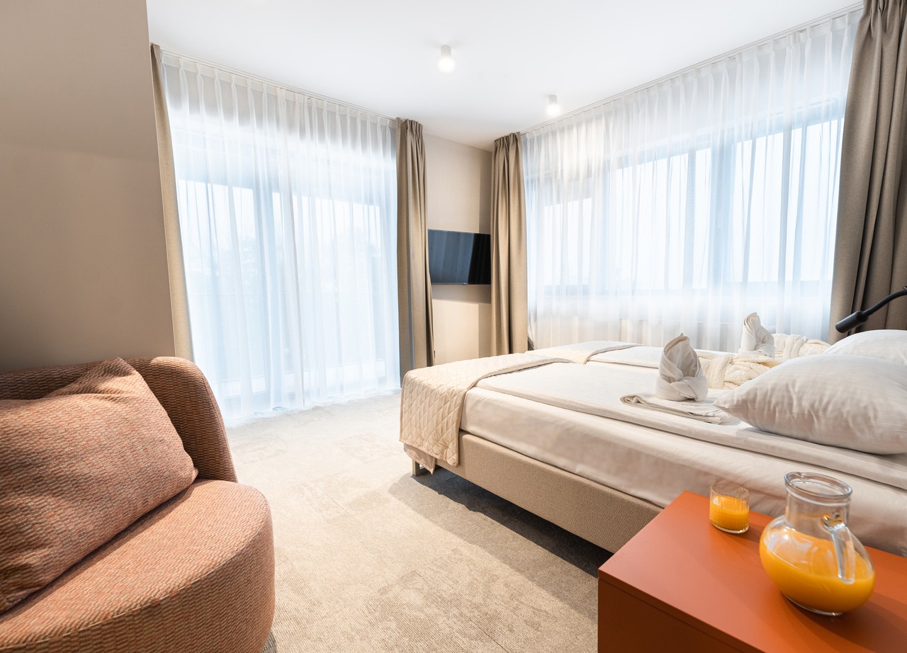 Pokój 2 osobowy Superior "Bestprice" z balkonem - min. 20 m²; sejf, balkon, czajnik, łazienka: toaleta, suszarka do włosów, prysznic, szlafrok - bezpłatnie; łóżko dwuosobowe, biurko, lodówka, telefon, telewizor, WIFI.